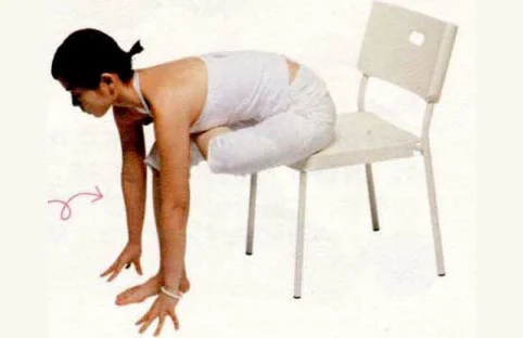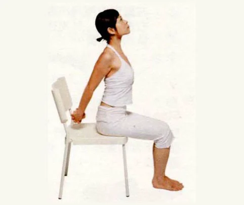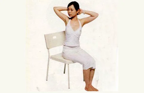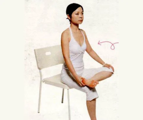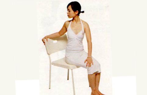 坐在椅子上,臀部坐正不要移動,身體從下腹部往右邊扭轉,左手放在右膝外側,右手放在椅背上,停留10個呼吸後,換左邊動作。