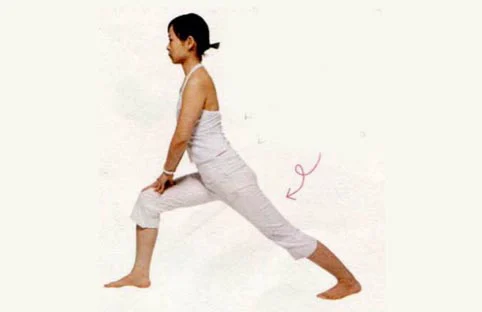 右腳往前方彎曲90度。膝蓋和腳趾頭超前,雙手撐在膝蓋前側,脊椎往上延伸,拉長左邊大腿髖關節前側和腹部的地方,停留10個呼吸後換腳動作。
