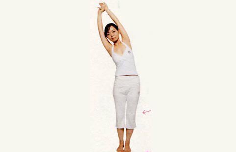 吸氣,右手拉住左手腕,吐氣,身體往右延伸,停留10個呼吸後,緩慢還原換邊。