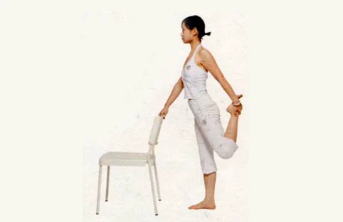 右手扶住桌子或椅子,左腳往後彎曲,左手抓住左腳踝,從左邊大腿前側開始往後拉,停留10個呼吸後換邊。