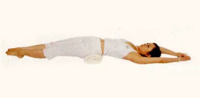 在骨盆後側墊瑜伽磚或毛巾,手腳往上下延伸拉長,腳尖下壓,停留3-5分鐘。