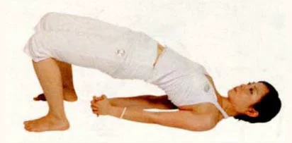 雙腳打開和臀部一樣寬,雙手背在身體後側,十指互扣,吸氣停留,吐氣,雙腳踩地板,讓整個身體離開地面,用臀部及腿後側的力氣將身體推高,不要用腰的力氣,停留10個呼吸。