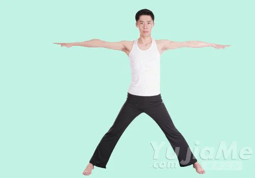 2、吸氣,雙腳盡可能地分開;雙臂舉起與肩同高,掌心向下,呈一直線平行於地面;整個身體呈一個“大”字。