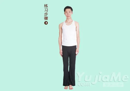 1、按基本站姿站立,兩腳併攏,兩手自然垂放在身體兩側,腰背挺直,抬頭,目視前方。