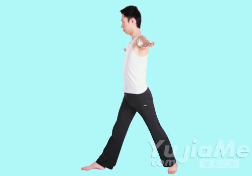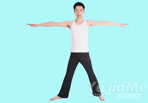 2、吸氣,右腿向右邁出一步,轉動右腳尖向側前方;雙臂平舉,掌心向下,整個身體呈一個“大”字。