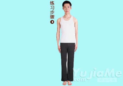 1、自然站立,雙腳併攏,兩手垂放在身體兩側;挺直腰背,收緊腹部,目視前方,均勻呼吸。