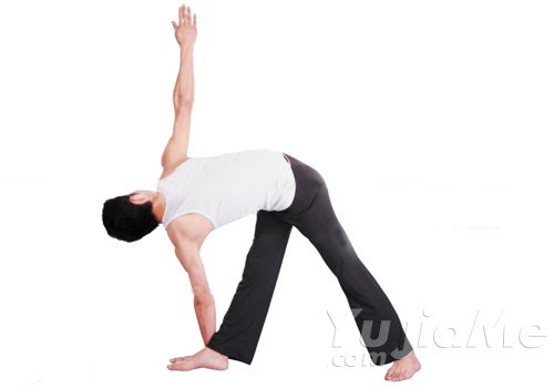 體式介紹:三角轉動式,是三角伸展式的變體,是在三角伸展式的基礎上加上扭脊翻轉的動作而成。