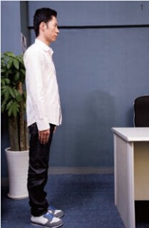 1、按基本站姿站立在辦公桌前,雙腳併攏,雙手自然垂放在身體兩側,腰背挺直;抬頭,目視前方,吸氣。