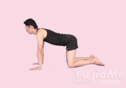 1、雙手撐在地上,手指向前;雙腿稍微分開,膝蓋及小腿貼在地上,大腿垂直於地面。