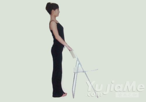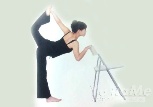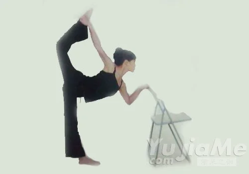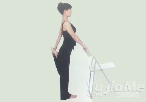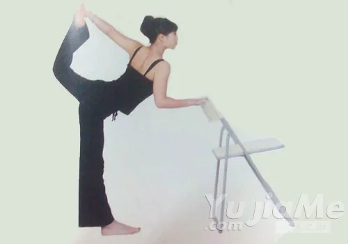 2、彎曲左膝,左手抓住左腳,右手抓住椅子。