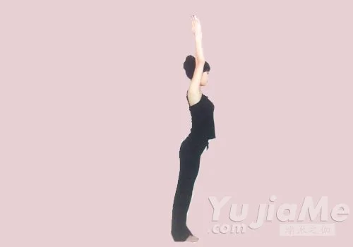 2、吸氣,手臂伸直向頭頂上方舒展,掌心相對。