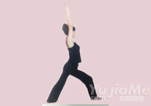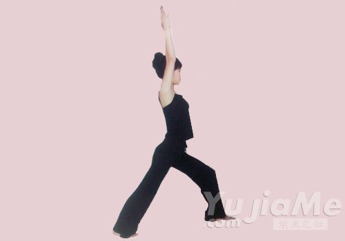 5、換左腳向前跨一步,並且屈左膝,右腿向後伸直,右腳腳跟貼地。保持10秒,深呼吸。