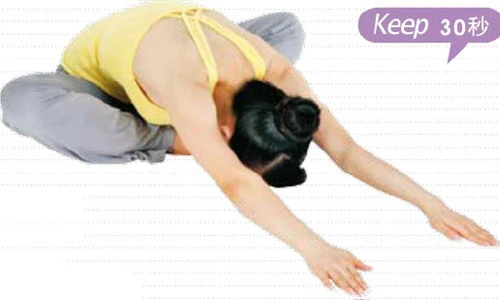 保持以上姿勢30秒,手臂向前伸展,帶動上身繼續向下彎,盡可能地伸展脊柱。