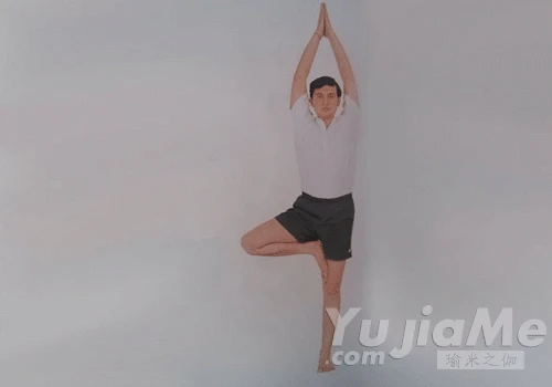 相比於前兩種,它的難度係數稍高,但也正因為練習這個動作時需要集中精神保持身體平衡,大腦無暇顧及其他,所以減壓放鬆的效果很好。動作是:雙腳併攏站立,抬起右腿,越高越好,用右腳掌抵住左腿,雙手胸前合十,然後慢慢舉過頭頂。這個姿勢充分放鬆兩髖,強健腳踝,也讓上半身得到伸展。