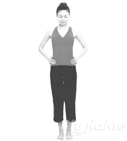 山式站立,雙手放在腰間,閉上雙眼。慢慢地深呼吸,同時將注意力集中在骨盆上,使身體安定下來。呼氣,同時感覺到身體在向大地裡插根,能量向下走。