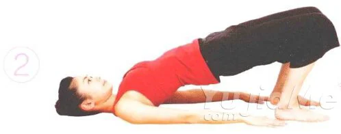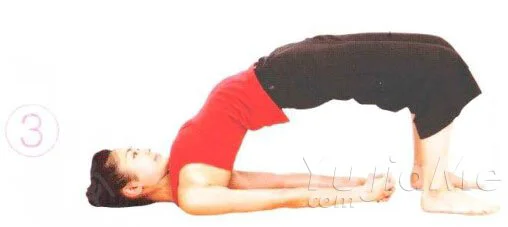 ③ 雙手緊握放在背部下方,盡量併攏肩胛骨。吸氣,抬升胸部,使骨盆再抬高一些。深呼吸3次。
