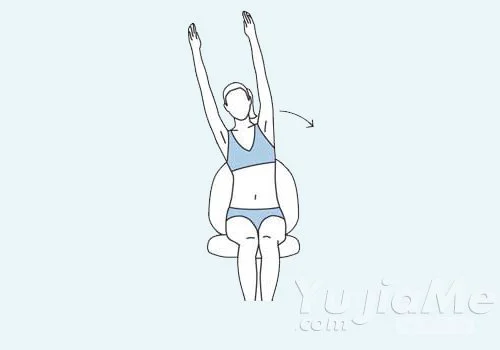 2、端坐在椅子上,兩腳併攏,雙手緊貼頭部兩側高舉,腰部活動,上身隨之向身體兩側搖擺。