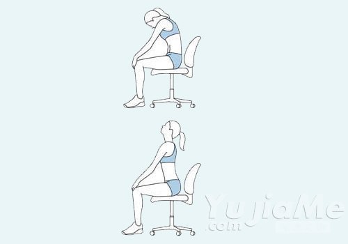 1、端坐在椅子上,兩腳併攏,雙手置於膝蓋處,吸氣,低頭,呼氣,頭後仰,充分活動頸部。