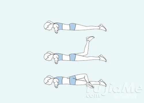 8、俯臥,雙手側平放,右腿屈膝,小腿與地面成90°,擺向右側,置於左膝蓋上。恢復,換腿,重複。