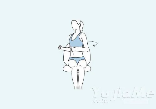 3、端坐在椅子上,兩腳併攏,屈肘,雙手握拳,置於腰間,身體交替向左右兩側轉。