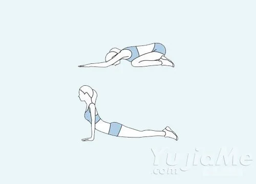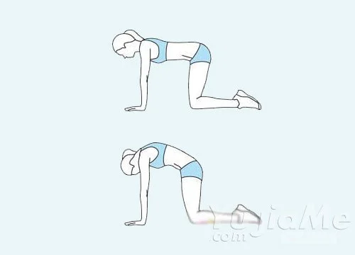 6、貓式瑜伽。雙膝跪地,身體前傾,雙手放在地面上,吸氣,抬頭,塌腰,稍微停頓一下,呼氣,低頭,拱背,保持動作呼吸2次。