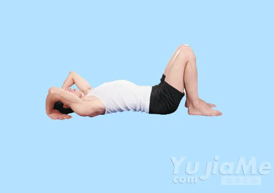 2、兩腳略微分開,雙膝彎曲拱起,小腿向內收;雙手移向頭部,肘關節彎起,手心反過來著地,手指指向肩膀,吸氣。
