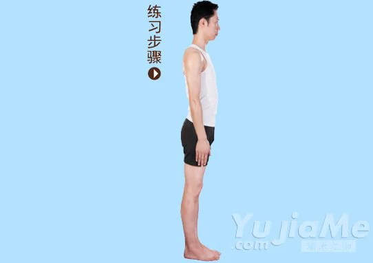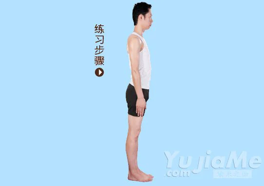1、自然站立,雙腳併攏,兩手垂放在身體兩側;挺直腰背,收緊腹部,目視前方,均勻地呼吸。