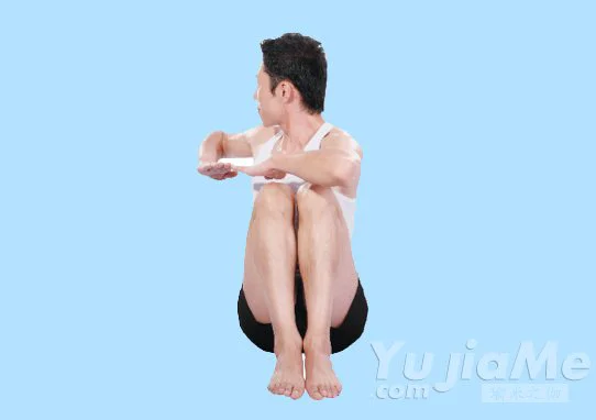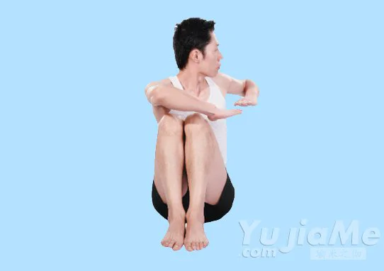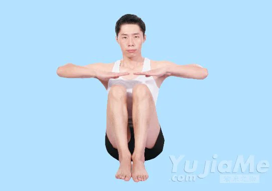 3、保持屈膝蹲坐的姿勢,雙手平舉,在身體兩側張開,形成一條直線平行於地面,掌心向下。