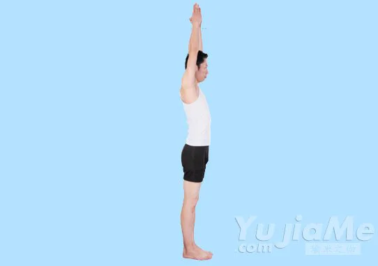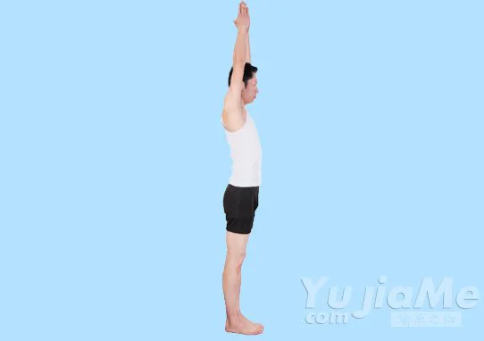 2、吸氣,雙手在胸前合十,接著雙臂向上推舉,直到雙臂夾住雙耳,合十的手掌置於頭頂上方;保持挺直站姿,且自然呼吸。
