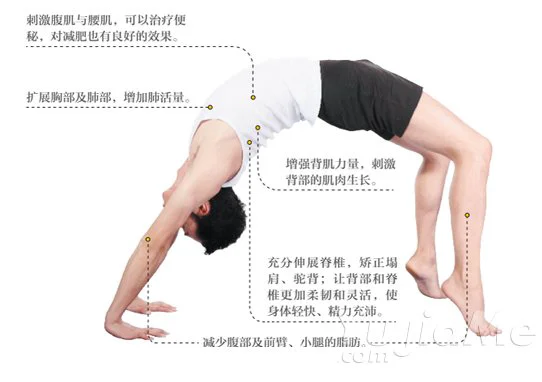 體式介紹:Urdhva的意思是向上,Dhanu的意思是弓。在這個體式中,身體向上呈拱形,靠手掌和腳掌支撐。