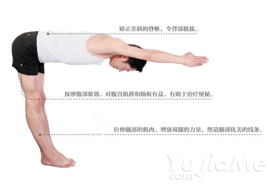 3、呼氣,彎腰,直到身體平行於地面,與雙腿構成90度角;保持姿勢5-10秒鐘,吸氣,緩慢起身,恢復站姿,且反覆練習。