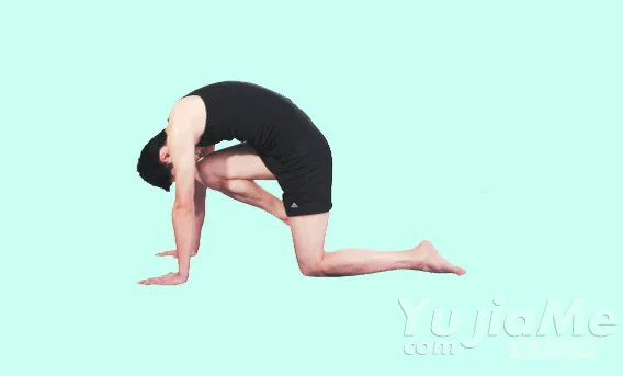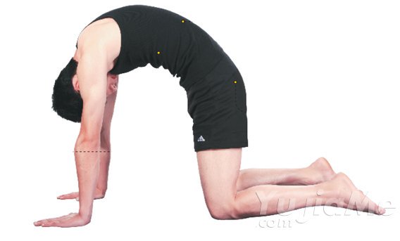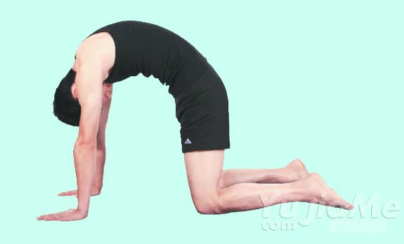 3、呼氣,低頭,視線望向大腿位置,同時慢慢地把背部向上拱起,直至感到背部有伸展的感覺;重複以上動作6-10次。