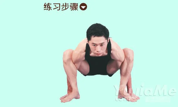 1、蹲姿,雙腿分開,臀部抬至與地面平行。雙臂穿過雙腿內側,掌心於腳後貼地。雙腿放在雙臂外側的上端。