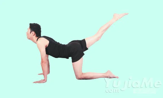 2、抬起右腿與地面平行,盡量向後伸展;雙手撐在地上,用左腳膝蓋支撐身體;使脊柱保持平直狀態,自然呼吸。