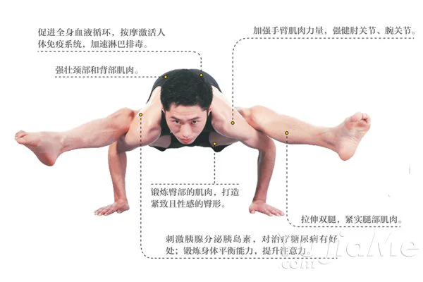 2、吸氣,目視前方,雙腳離地,雙腿伸直,用雙胃撐起身體,控制身體平衡。保持數秒,呼氣,身體還原。