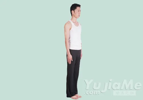 1、按基本站姿站立,兩腳併攏,兩手自然垂放在身體兩側,腰背挺直,抬頭,目視前方。