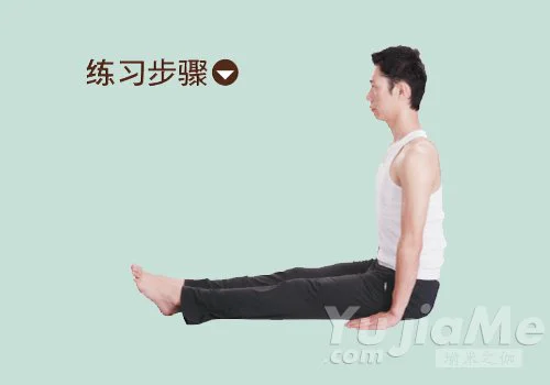 1、坐在墊子上,兩腿併攏,向前伸直;挺直腰兩手放在身體兩側的地面上。手指向前。