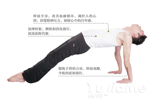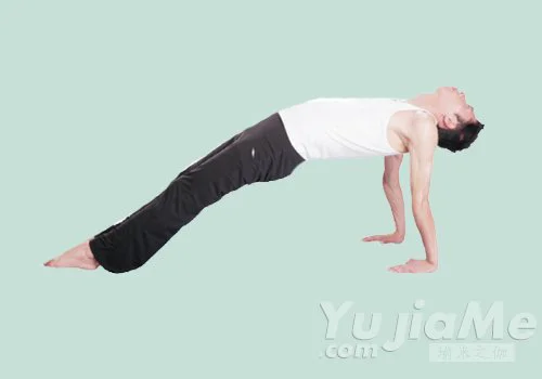 3、呼氣,收縮腹部,雙臂慢慢支撐起身體,將臀部抬離地面,盡量伸直兩膝;頭向後仰,保持數秒鐘,再慢慢恢復到坐姿,反覆練習。