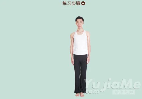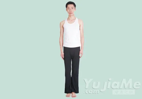 1、自然站立,雙腳併攏,兩手垂放在身體兩側;挺直腰背,收緊腹部,目視前方,均勻呼吸。
