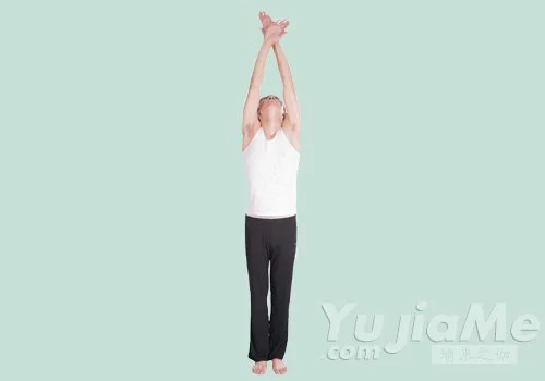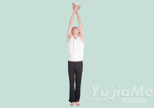 4、再深深地吸氣,手臂由身體兩側向上高舉,手腕在頭頂處再次相交,眼睛望向手指,屏住呼吸。
