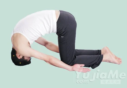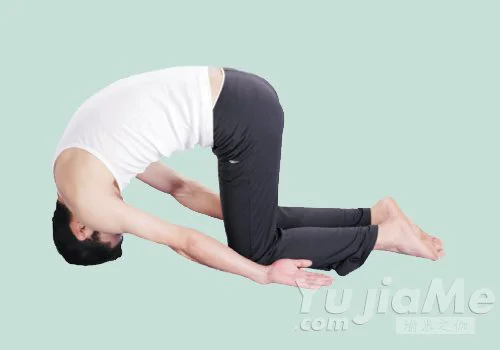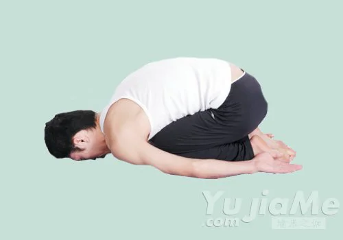 1、跪坐,臀部坐在兩腳腳後跟上;吸氣,上身緩慢向前彎曲,直至額頭觸地;雙手置於腳踝旁,掌心向上。