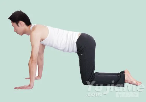1、跪立在地面上,雙腳分開,膝蓋和小腿著地,大腿與地面呈90度角;雙臂伸直撐在地面上,手指尖指向前方;頸、背、腰呈一條直線。