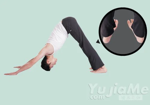 3、呼氣,抬高臀部;腳後跟和肩膀同時下壓,腳掌呈內“八”字形站立,這時身體與地面呈三角形,保持呼吸8次。