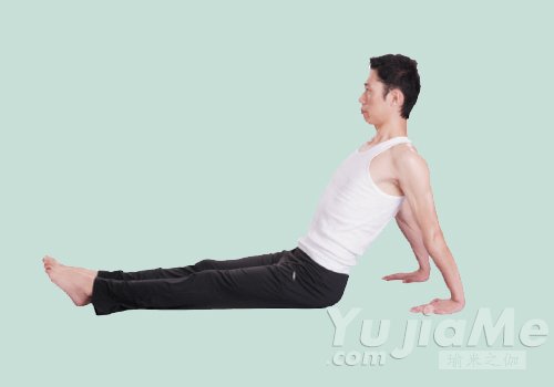 2、吸氣,雙手支撐住身體,雙腿向後伸直;一直伸到身體呈一斜板狀,兩腳尖蹬地。