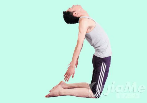 2、吸氣,雙手向後伸;同時由上背開始,慢慢把身體向後彎,收緊大腿股四頭肌、臀部和腹部;頭和胸後仰,不要過分地伸展頸項。