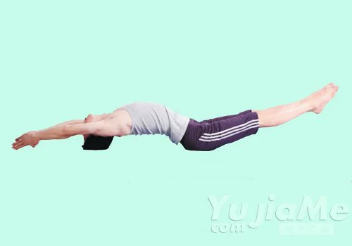 4、雙手保持合十,伸向後方,盡量伸直;同時雙腳抬起,與地面形成約30度角;腰腹向上挺起,自然呼吸,保持一段時間。