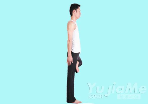 5、調勻呼吸,深吸一口氣,雙手用力撐起,右腳尖離地;屏住呼吸,保持數秒鐘。呼氣放下右腳,恢復站姿,換腳反覆練習。
