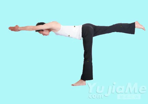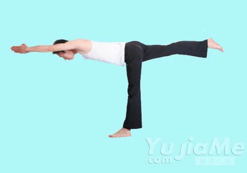 3、慢慢彎腰,身體前傾;同時抬起右腿,伸直,與手臂、軀幹呈一條直線,平行於地面,保持平衡,此姿勢停留3次呼吸以上。恢復站姿,換腿反覆練習。