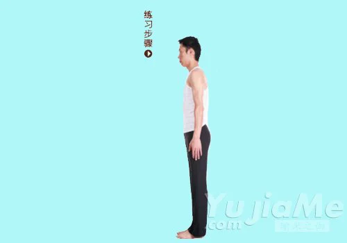 1、按基本站姿站立,兩腳並瓏,兩手自然垂放在身體兩側,腰背挺直,抬頭,目視前方。