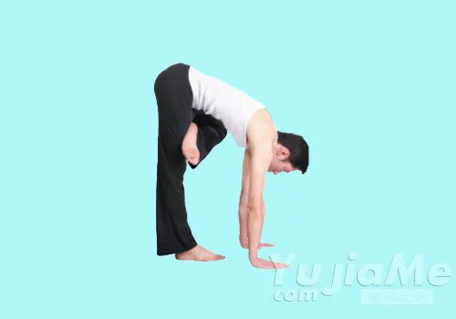 3、以髖關節為軸,身體向下彎曲,脊背保持筆直;同時伸出雙手,撐在地面上。
